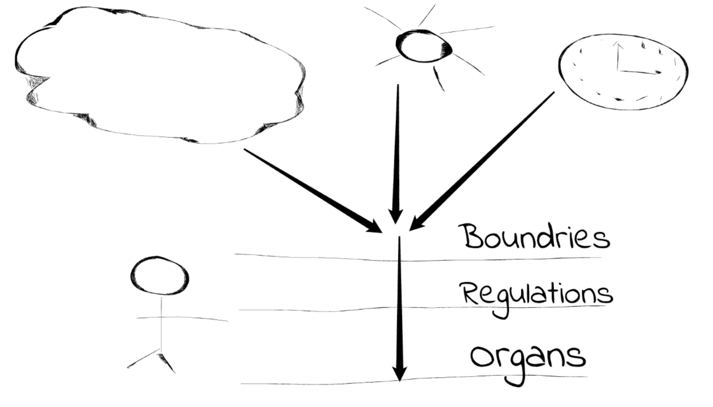 - Boundary: interfaces between the environment and the body. For example, air doesn't flow directly into the lungs – it flows through the nose and air canals. We'll call it the Respiratory boundary.