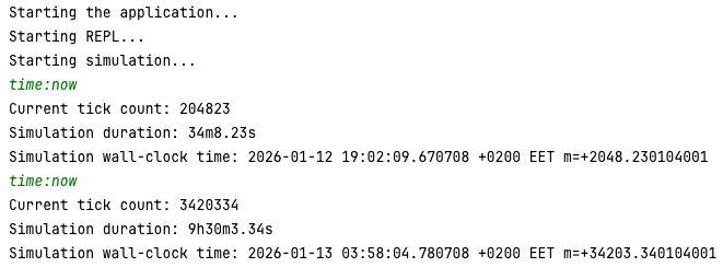 Each simulation step runs both meshes and advances time by 10 ms. On my MacBook Pro 2023, the simulation currently runs at roughly 9.5 hours of simulated time per 1 minute of real time. This gives us a baseline to benchmark performance once the components are filled with actual behavior.